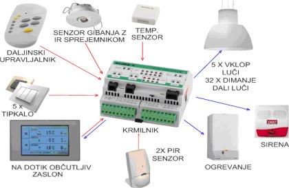 Za stanovanje je potreben krmilnik, kar nam omogoča uporabo 10 vhodov (senzor gibanja ,tipkalo za vklop luči, …) in 8 izhodov za krmiljenje tokokrogov (ogrevanja, hlajenja, luči, sirene …).