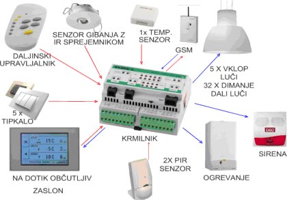 V sistemu so predvideni 4 senzorji gibanja, 5 tipkal za luči, vklop/izklop luči v 5 prostorih, krmiljenje peči ogrevanja,krmiljenje klime, izklop vtičnic, 1 temperaturni senzor, 1 daljinski upravljalnik, 1 na dotik občutljiv zaslon ČB 3,5”, 1 notranja sirena z bliskavico.